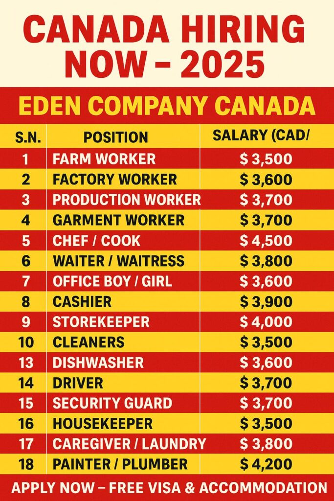 Eden Company Canada announces jobs every year. This year, we’ve announced 10,122 new job openings across hospitality, logistics/warehousing, manufacturing, construction & skilled trades, food processing, agriculture/seasonal, retail/customer service, driving (light/heavy), and security. Interviews are conducted online, so you can apply without having to go anywhere. A Company HR manager will call and take your interview. If your documents are eligible and match a role, we’ll schedule your online interview with a verified Canadian employer; if you’re selected by the employer, you’ll receive a formal job offer later from Eden Company. We welcome applicants from Pakistan, India, Nepal, Bangladesh, and beyond. Apply today to start your career in Canada for a bright future.
